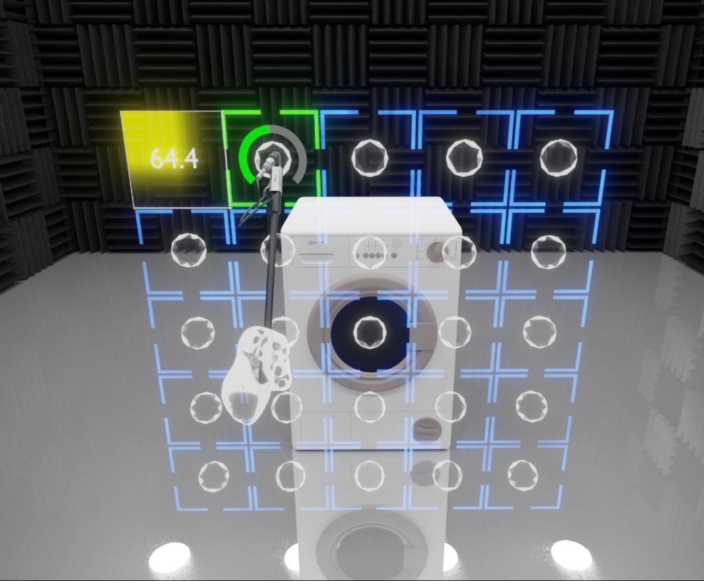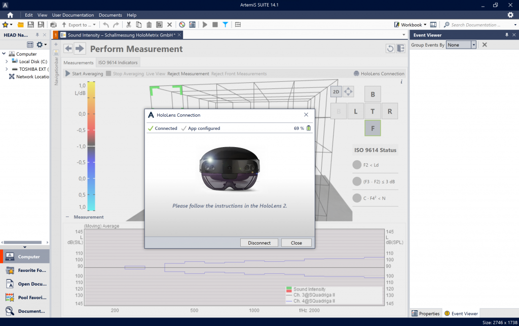 Mit der erfolgreichen Messung aller Teilsegmente baut sich automatisch eine Schallfeldkarte auf. Diese Visualisierung erleichtert zum einen maßgeblich die Interpretation und zum anderen auch die Detektion von akustischen Problemzonen. Anschließend können Maßnahmen ergriffen werden, um die akustischen Emissionen des Messobjektes zu reduzieren, falls dies notwendig ist. Die Messergebnisse werden aber nicht nur in der HoloLens visualisiert, sondern werden automatisch auch an den PC übertragen und in ArtemiS SUITE angezeigt. Nach abgeschlossener Messung können diese gespeichert werden, um Sie ggf. mit späteren Messungen zu vergleichen.